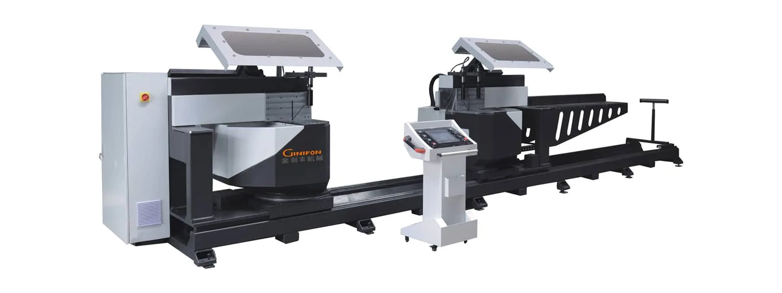 This machine is mainly used for cutting doors, windows, curtain walls, or industrial profiles at any angle. The rotation angle of the workbench is 22.5°-140°, and the swing angle of the saw blade ranges from 90°to 45°. The feeding method adopts a damping method to ensure stable feeding and rapid retraction, avoiding gas channeling and knife shaking during use. The maximum outer diameter of the diamond saw blade can reach 600mm, with high linear speed and high machining precision. The swing angle of the saw blade of this machine tool is driven by a high-precision servo electric cylinder; Both rotation and length positioning adopt servo plus closed-loop repetitive positioning. The sawing adopts a special 4kw high-power motor, which is more suitable for cutting industrial profiles, aluminum curtain wall materials in oversized sizes, and various arbitrary angles. It can be controlled by online ERP (optional), and can be equipped with a vacuum cleaner (optional).